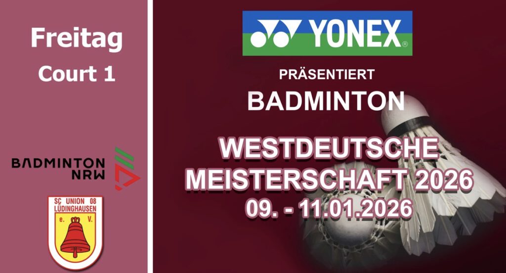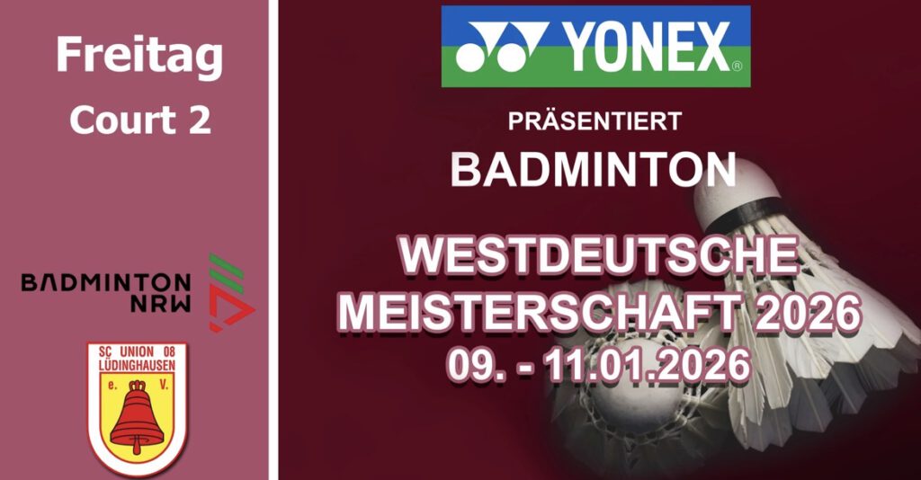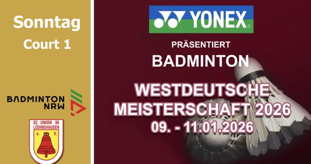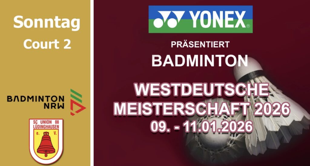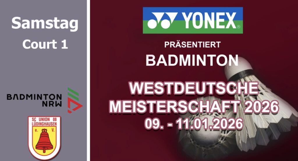 Der Badminton-Landesverband NRW als Veranstalter und der SC Union 08 Lüdinghausen als Ausrichter freuen sich am zweiten Wochenende im neuen Jahr 2026 mit allen Spielern, Betreuern, Offiziellen und Zuschauern auf dieses erste Badminton-Event 2026 in NRW.