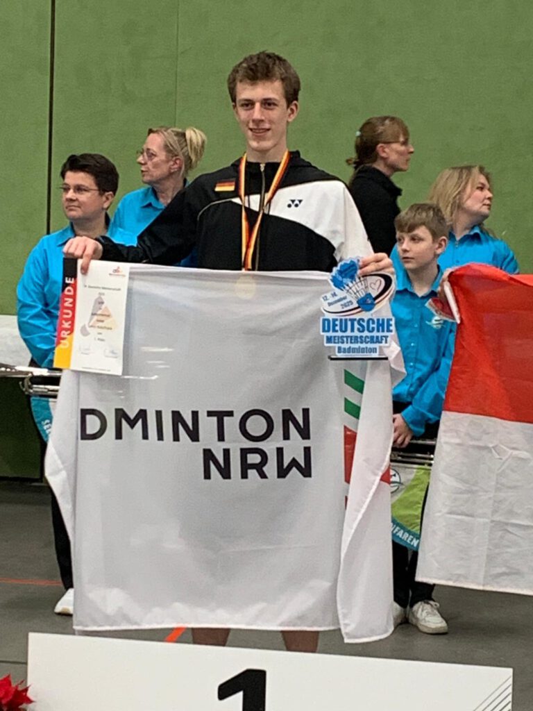 Leon Kaschura, der ebenfalls in allen drei Disziplinen an den Start gegangen war, war nicht minder erfolgreich. Im Jungeneinzel U19 zeigte er einmal mehr seine Klasse und musste nur im Halbfinale gegen Jarno Deters (1. BV Maintal) mit 19:21, 21:18 und 21:6 über die volle Distanz gehen. Im Finale gegen Mats Wohlers ließ er jedoch nichts anbrennen, siegte mit 23:21 und 21:15 und kürte sich so zum Deutschen Meister U19.