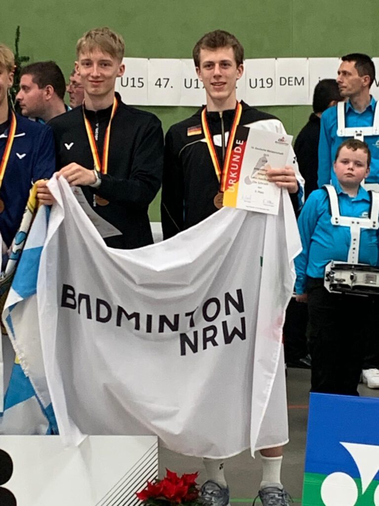 Im Jungendoppel U19 trat Leon mit Vereinskamerad Ole Schroth an. Das Union Duo ging von Setzposition vier ins Rennen, musste sich aber im Halbfinale den späteren Deutschen Meistern und top gesetzten Felix Schütt und Alexander Philipp Zhang (SV Harkenbleck/SV Fun-Ball Dortelweil) in drei Sätzen geschlagen geben. Dabei sah es nach dem ersten Satz gar nicht schlecht aus, hatten Leon und Ole den doch mit 21:18 gewinnen können. Doch dann kippte das Spiel und sie mussten sich mit dem dritten Platz zufriedengeben.