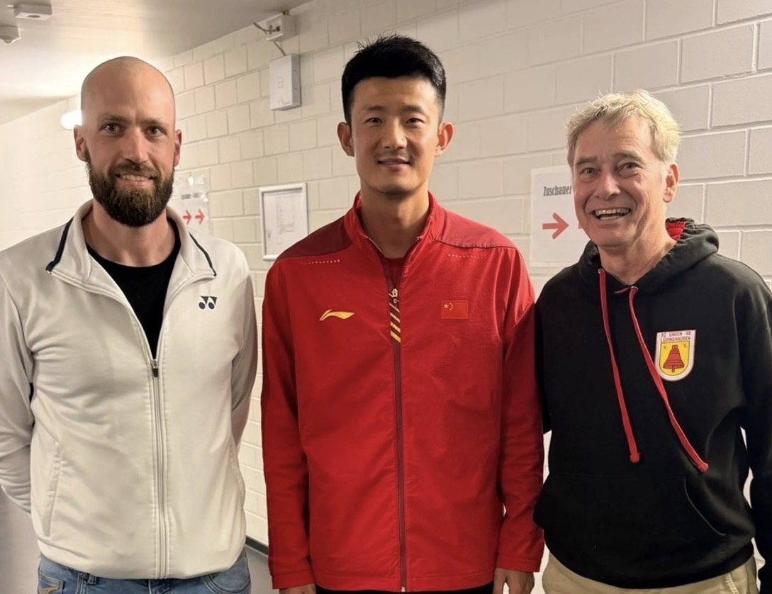 Begegnung am Rande des Badmintonturniers: Der ehemalige Olympiasieger und doppelte Weltmeister Chen Long, jetzt Trainer der chinesischen Jugendnationalmannschaft, wird umrahmt von Ralf Kemper (rechts), zweiter Vorsitzender der Badmintonabteilung und Sportwart Frederik Stegemann.  Foto: privat